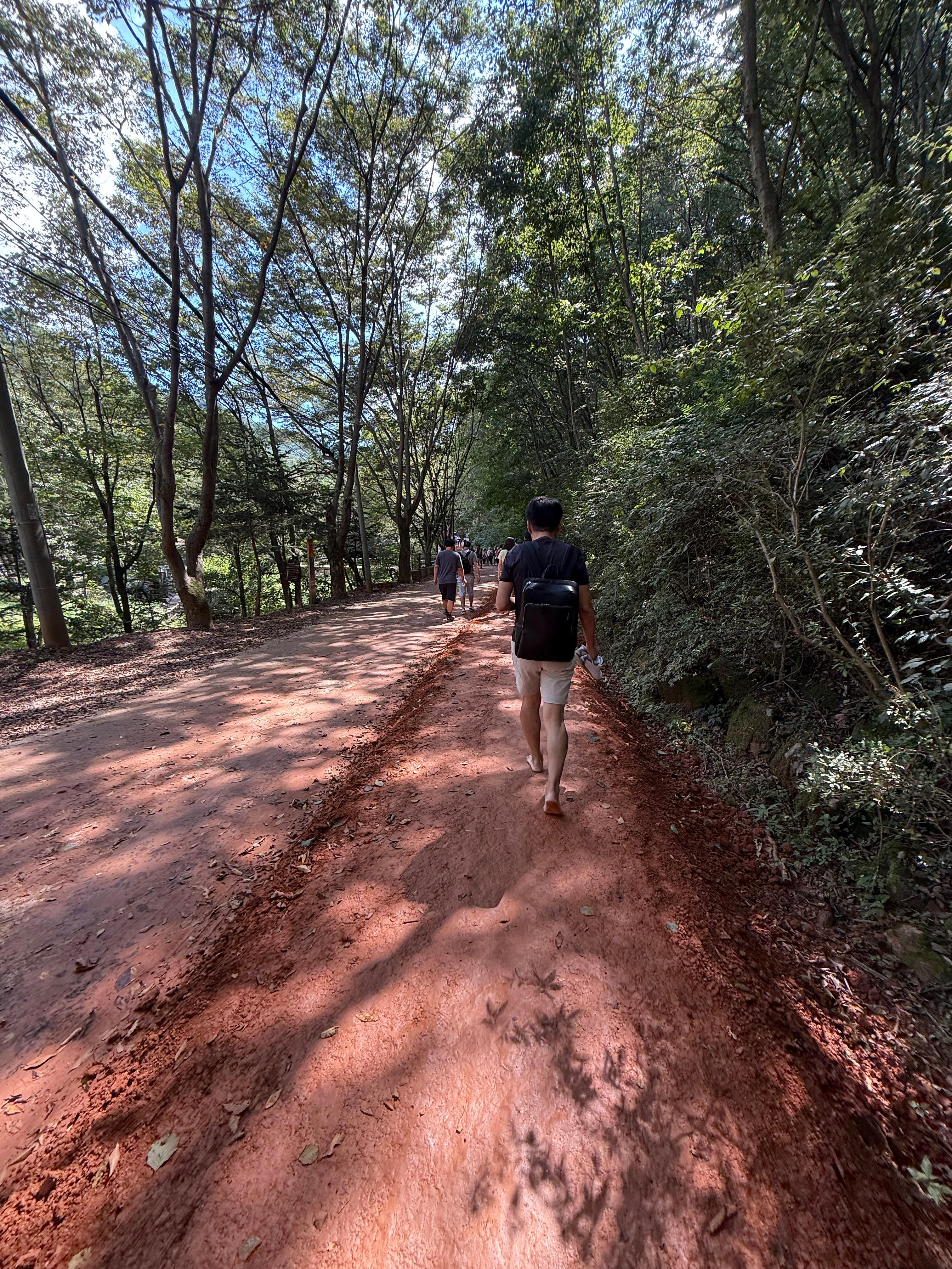 입구에 들어서자마자 가장 먼저 반겨준 건 황톳길. 신발을 벗고 발을 디디니, 촉촉하고 따뜻하며 시원한 흙의 감촉을 발끝에서부터 느낄 수 있었습니다. 바쁜 일상 속에서 잊고 있던 자연의 느낌이 마음까지 차분히 가라앉히는 듯했죠. 숲 사이로 스며드는 바람과 새소리가 더해져, 걷는 내내 일종의 수련을 하는 듯한 기분을 느끼는 찰나가 있는 시간이었습니다. 하지만 앞서거니 뒤서거니 황톳길을 걷는 여러 가족들이 내는 다양한 소리와 모습에 제 내면을 향한 시선은 바로 제 주변을 바라보게 되었습니다. 정말 다양한 사람들이 황톳길을 걸어가고 있었어요. 귀여운 아이들을 앞세운 젊은 부부, 심지어 유모차를 끌고 옆에서 함꼐 하는 아기 엄마, 풋풋한 애정을 드러내는 젊은 커플, 건강 관리에 진심인 듯 보이는 어른들의 모습이 곳곳에 보였습니다. 그러다보니 어느새 황톳길의 끝자락까지 지루한 줄 모르고 산책하게 되었습니다.